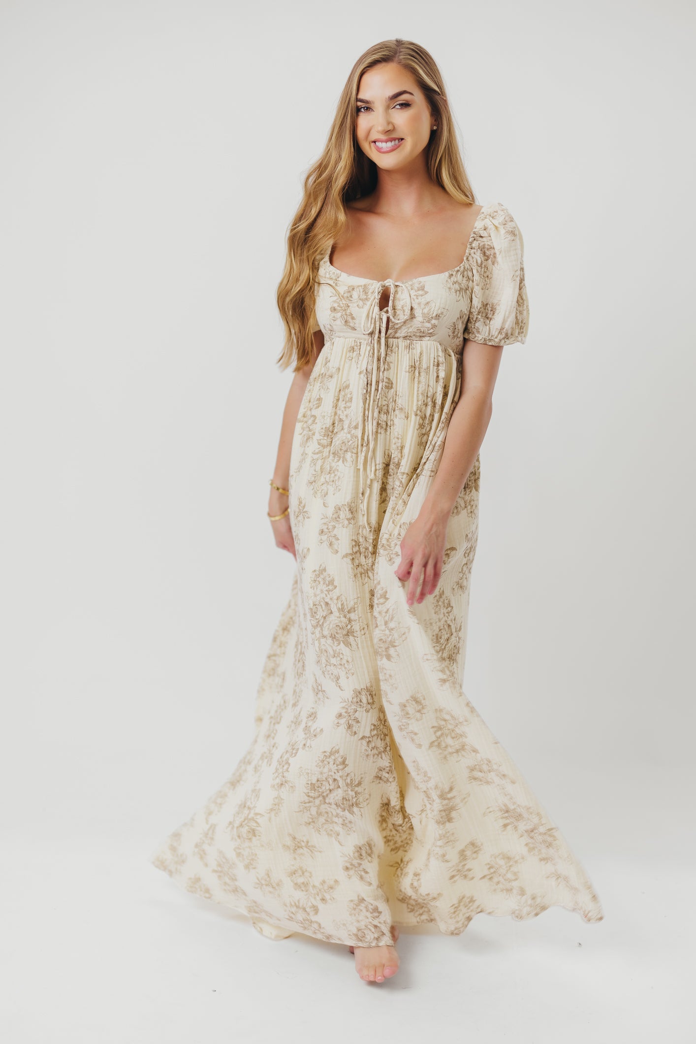 Haven 100% Cotton Tie-Front Maxi Dress in Taupe/Brown Floral - Bump Friendly