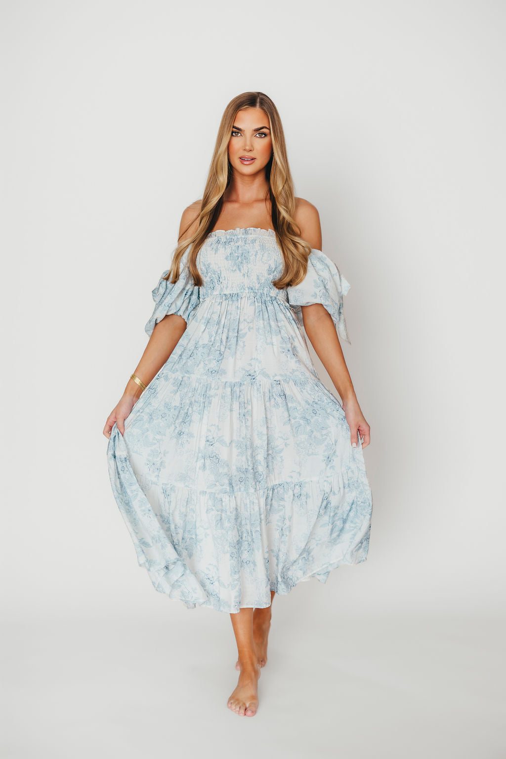 Elena Floral Print Smocked Midi Dress in Blue - Bump Friendly & Inclusive Sizing