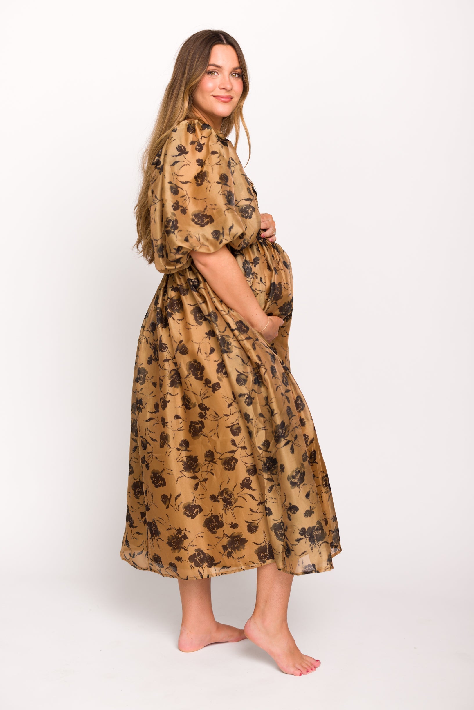 Harlow Camel & Black Floral Maxi Dress with Stretchy Neckline - Bump Friendly (Final Few)