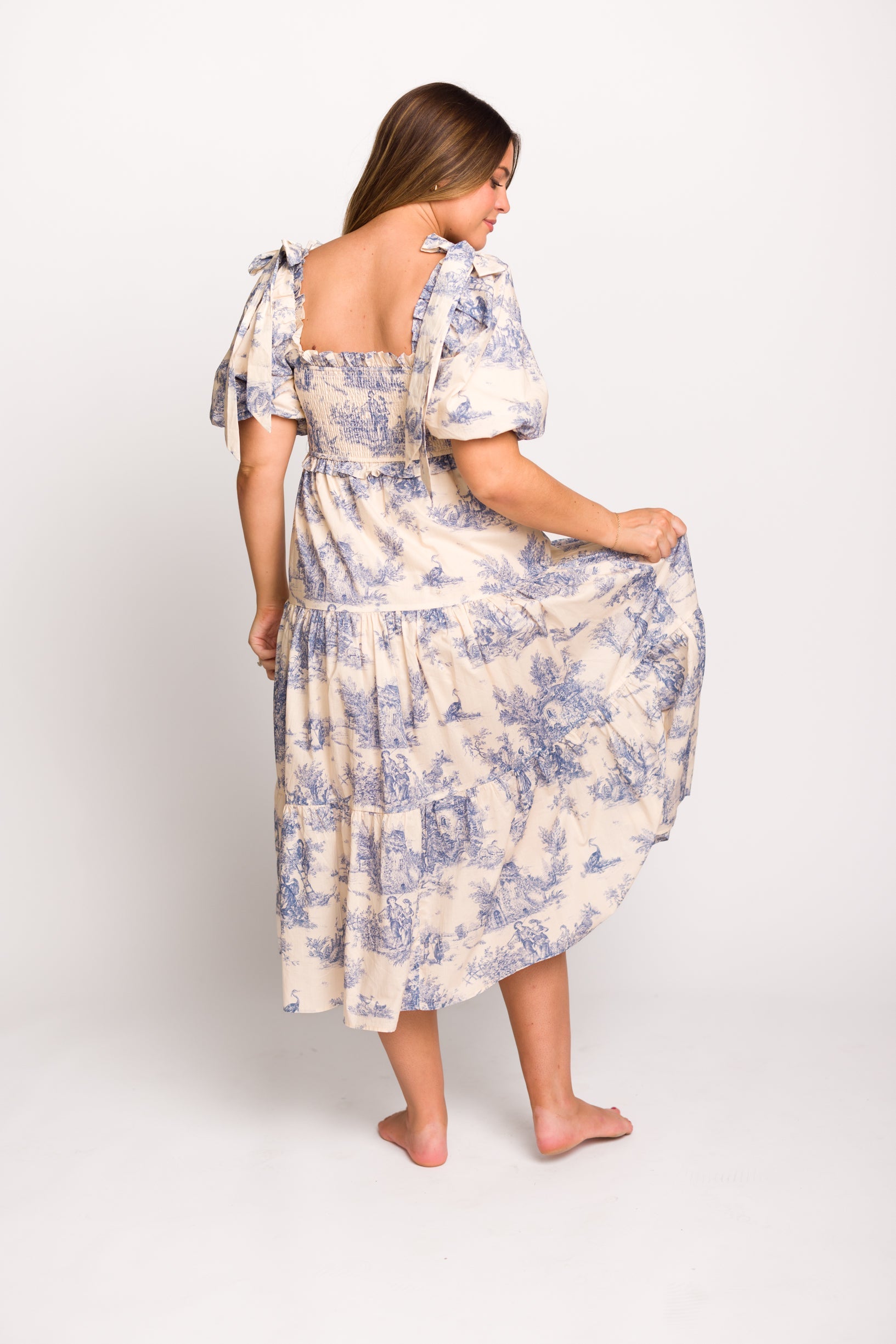 GARMENT DETAILS: Elegant midi dress in a romantic blue toile print, with a square neckline, statement puffed sleeves, and bow accents on the shoulders. Features a fully smocked bodice, with a multi-tiered skirt.